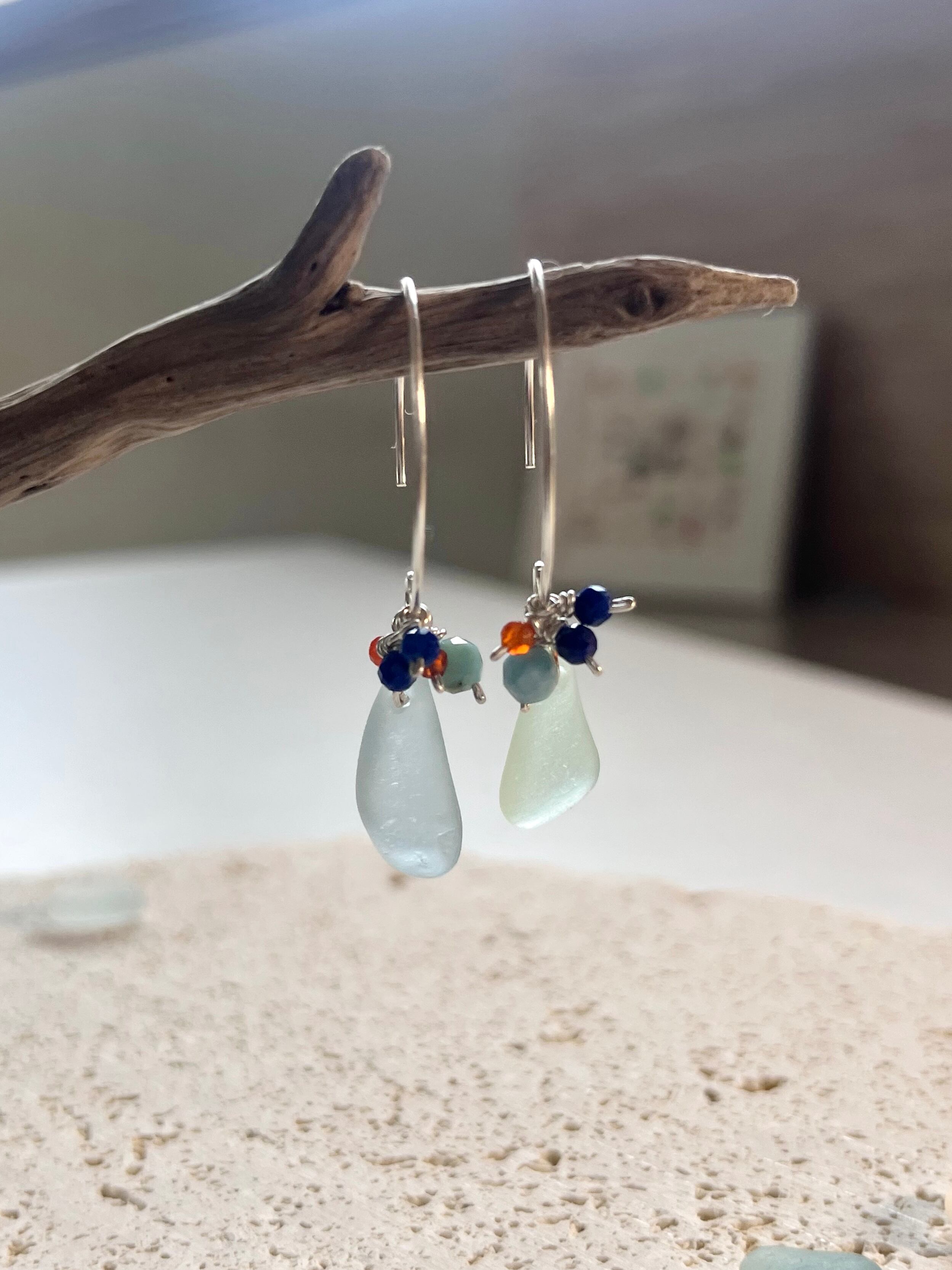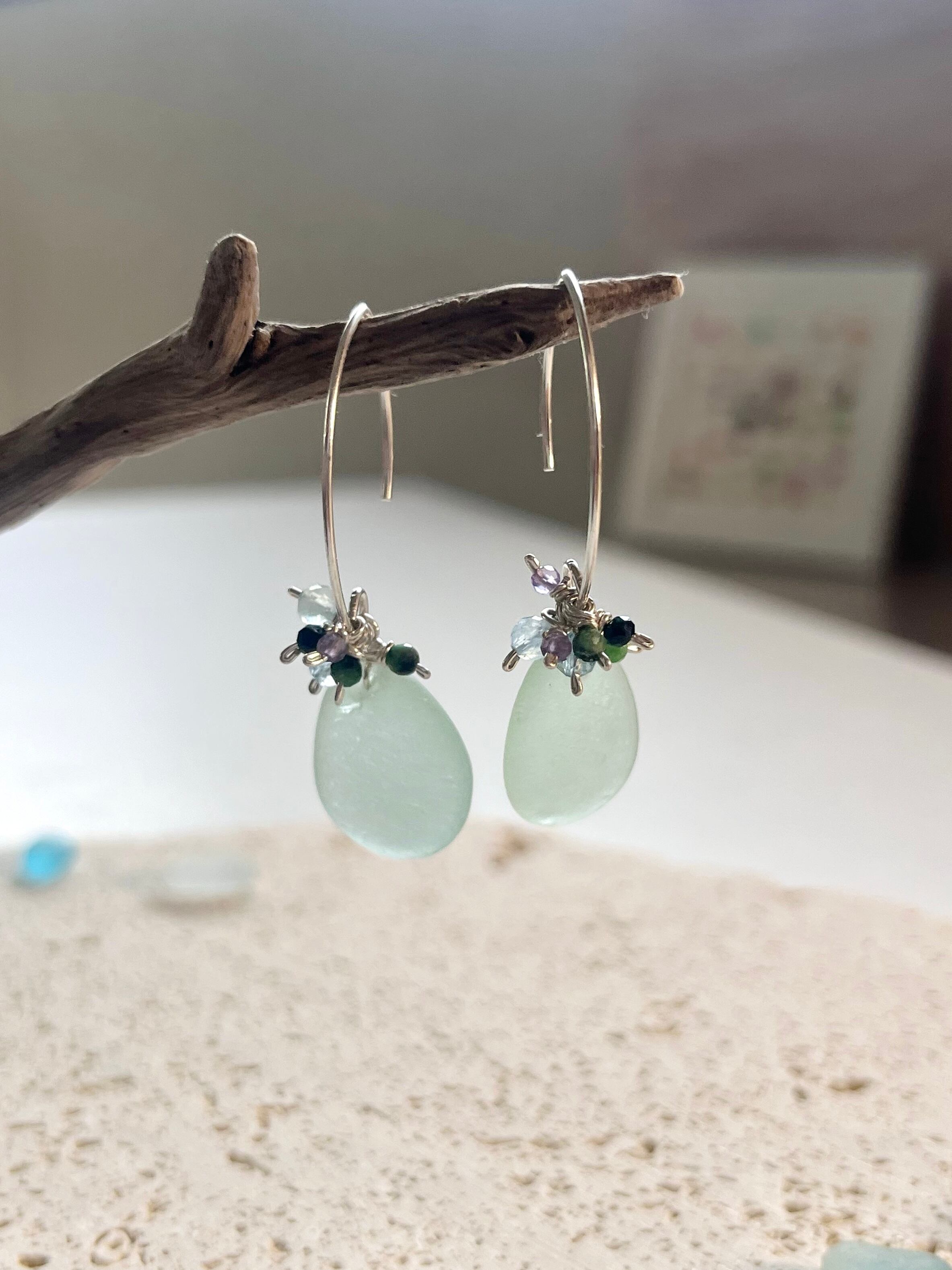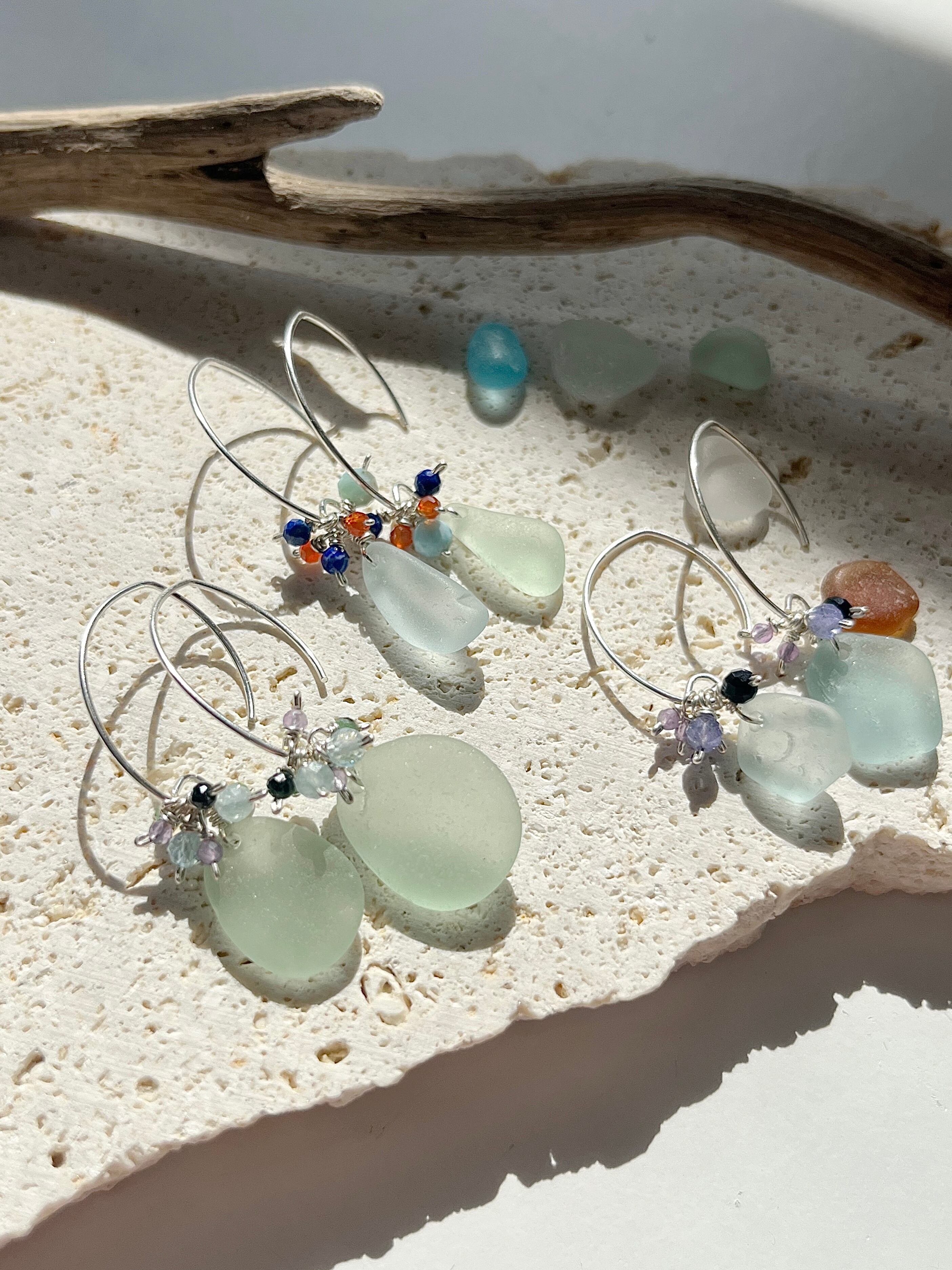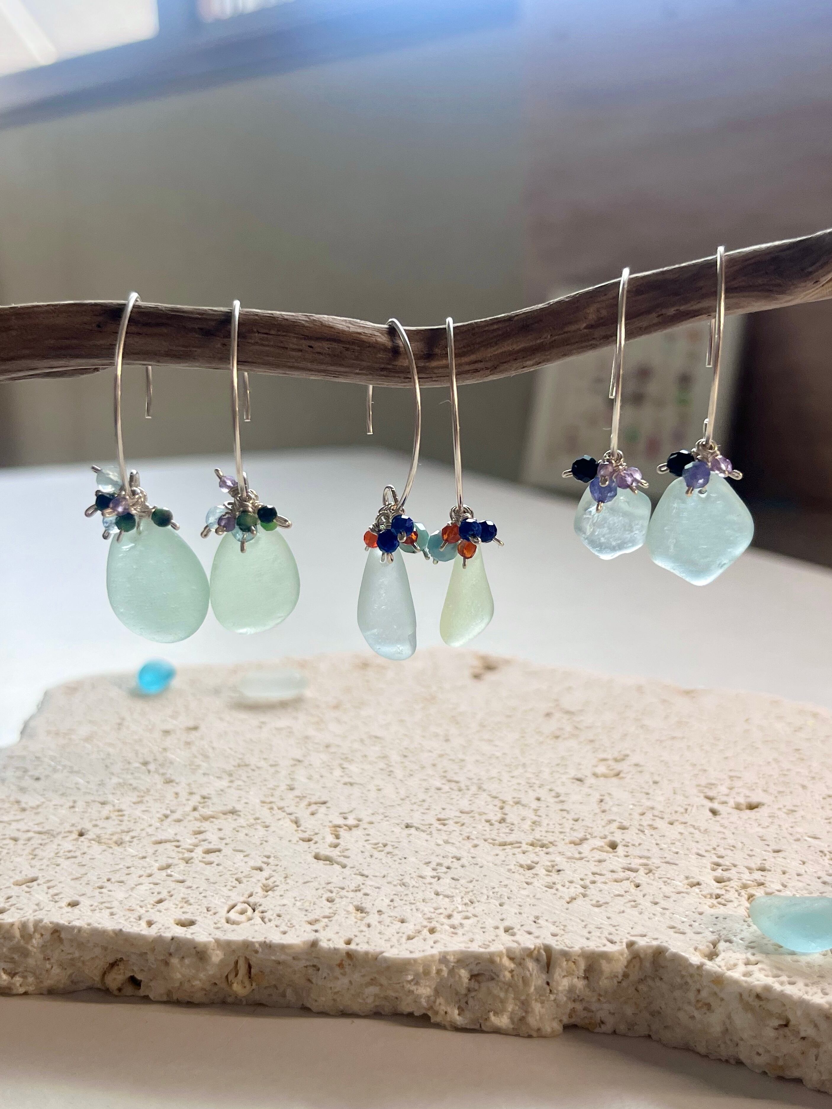 イヤリング変更可能(※イヤリングの金具の作り上、耳たぶのすぐ下に天然石とシーガラスが垂れるようになります)
