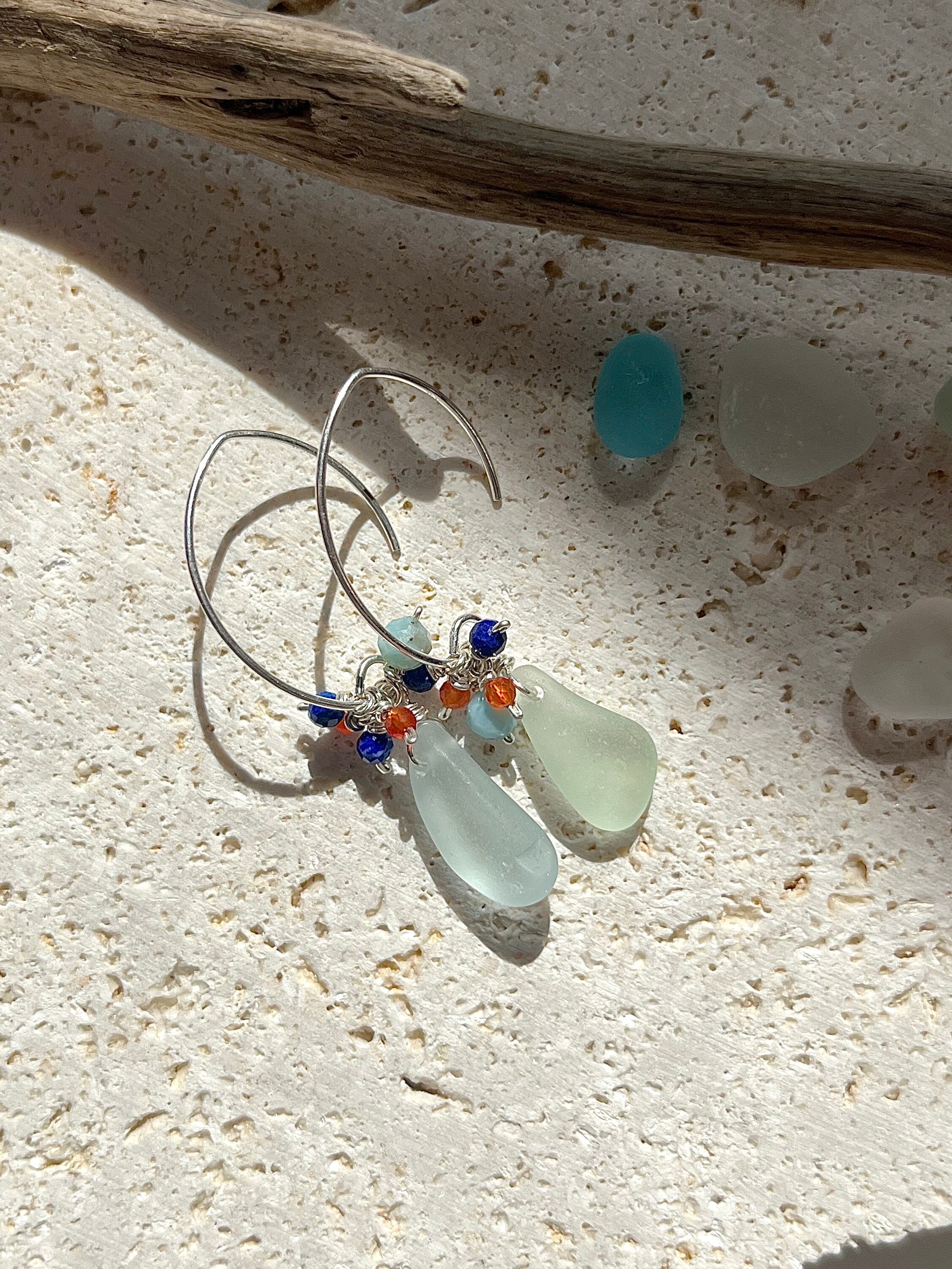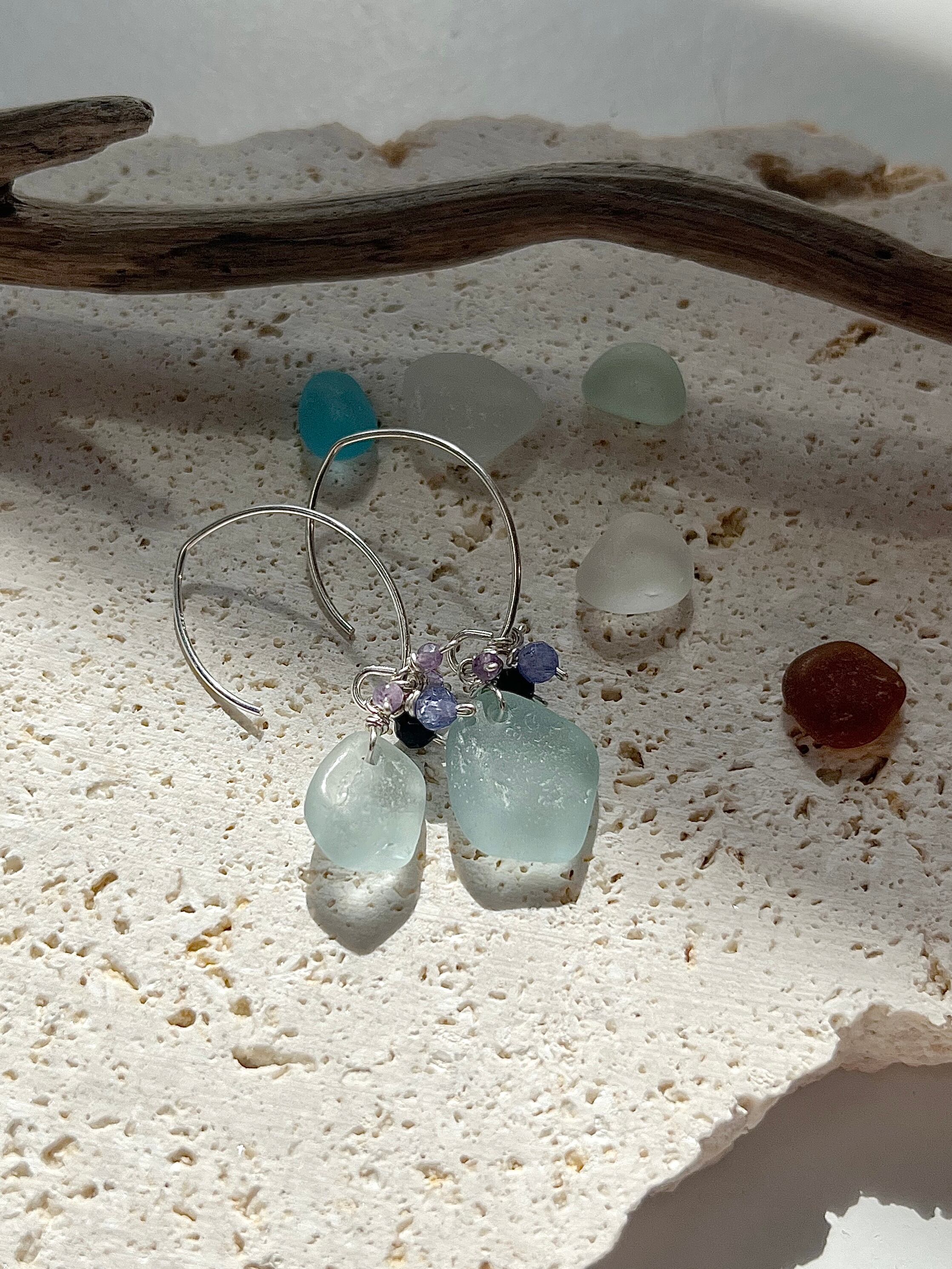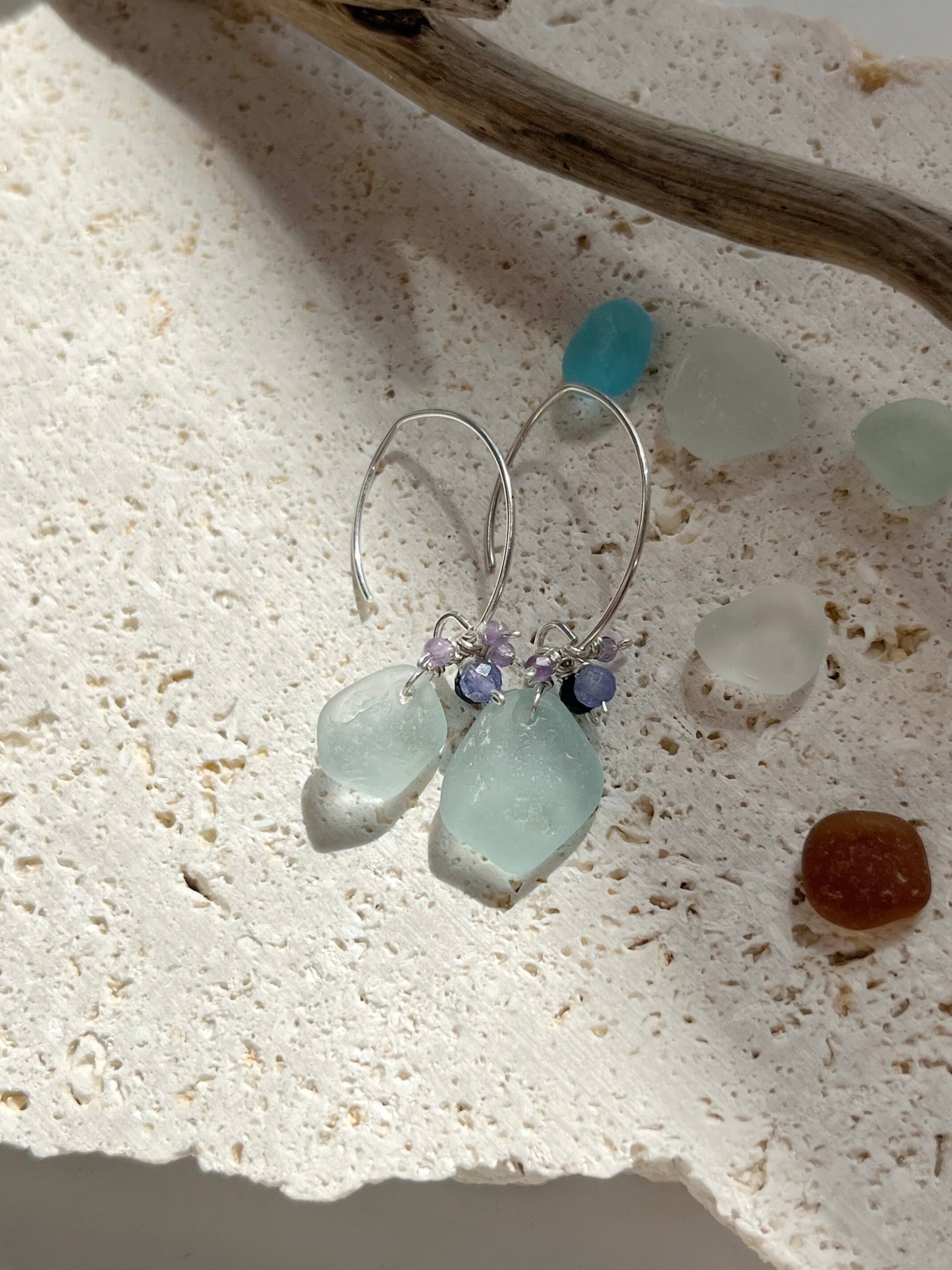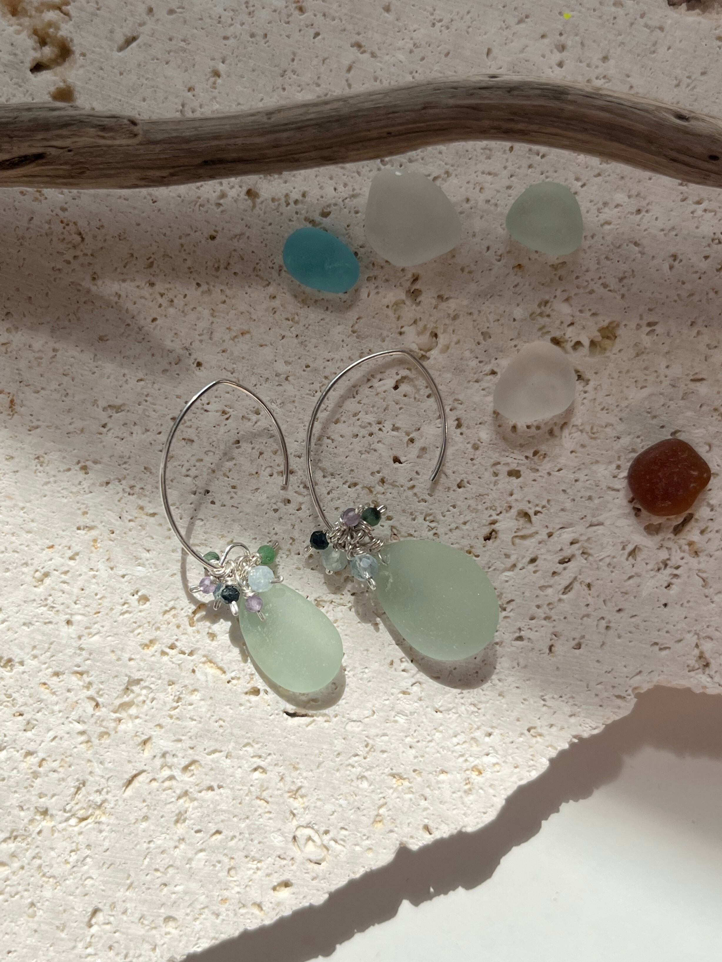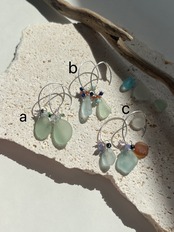 イヤリング変更可能(※イヤリングの金具の作り上、耳たぶのすぐ下に天然石とシーガラスが垂れるようになります)