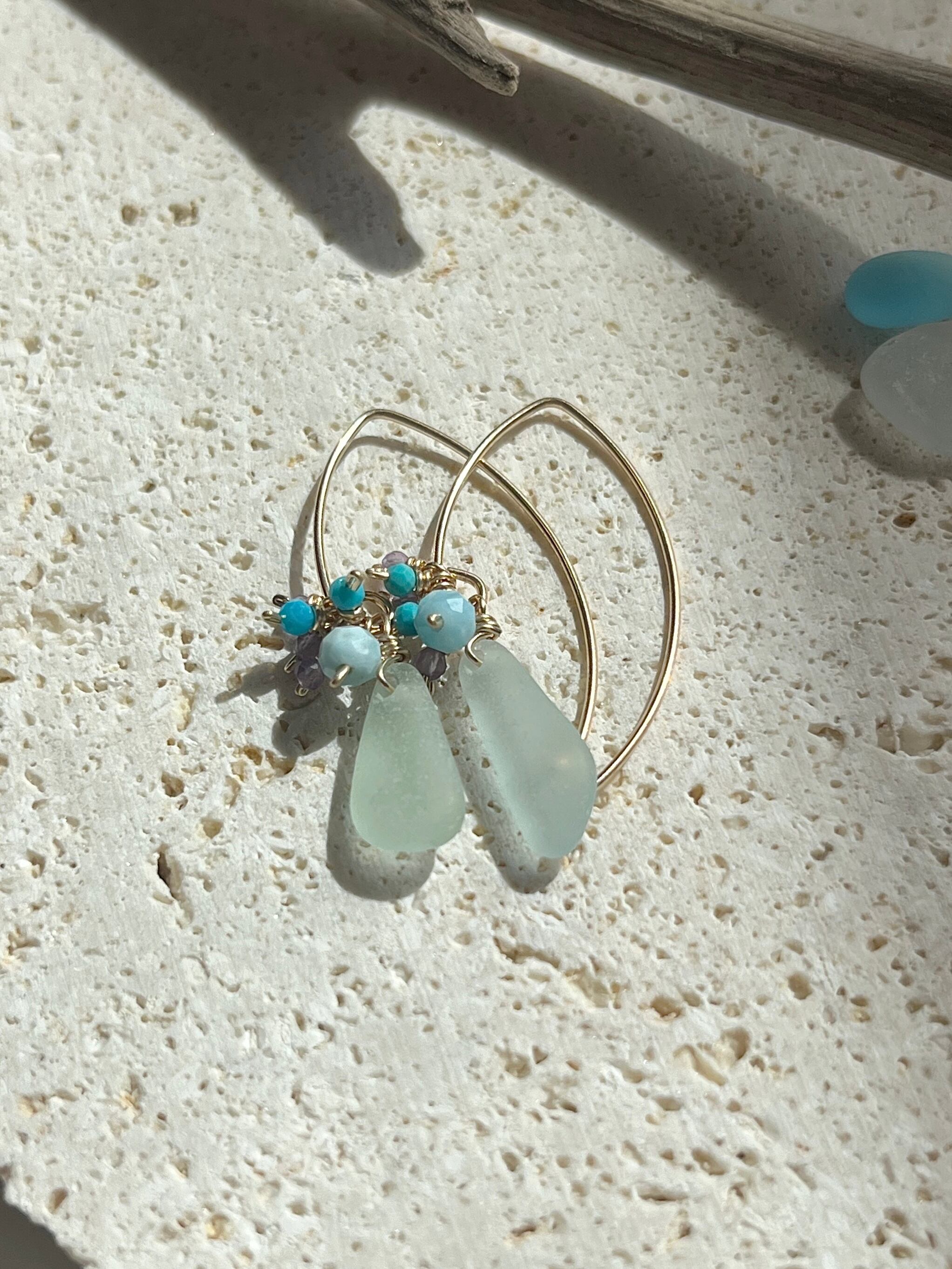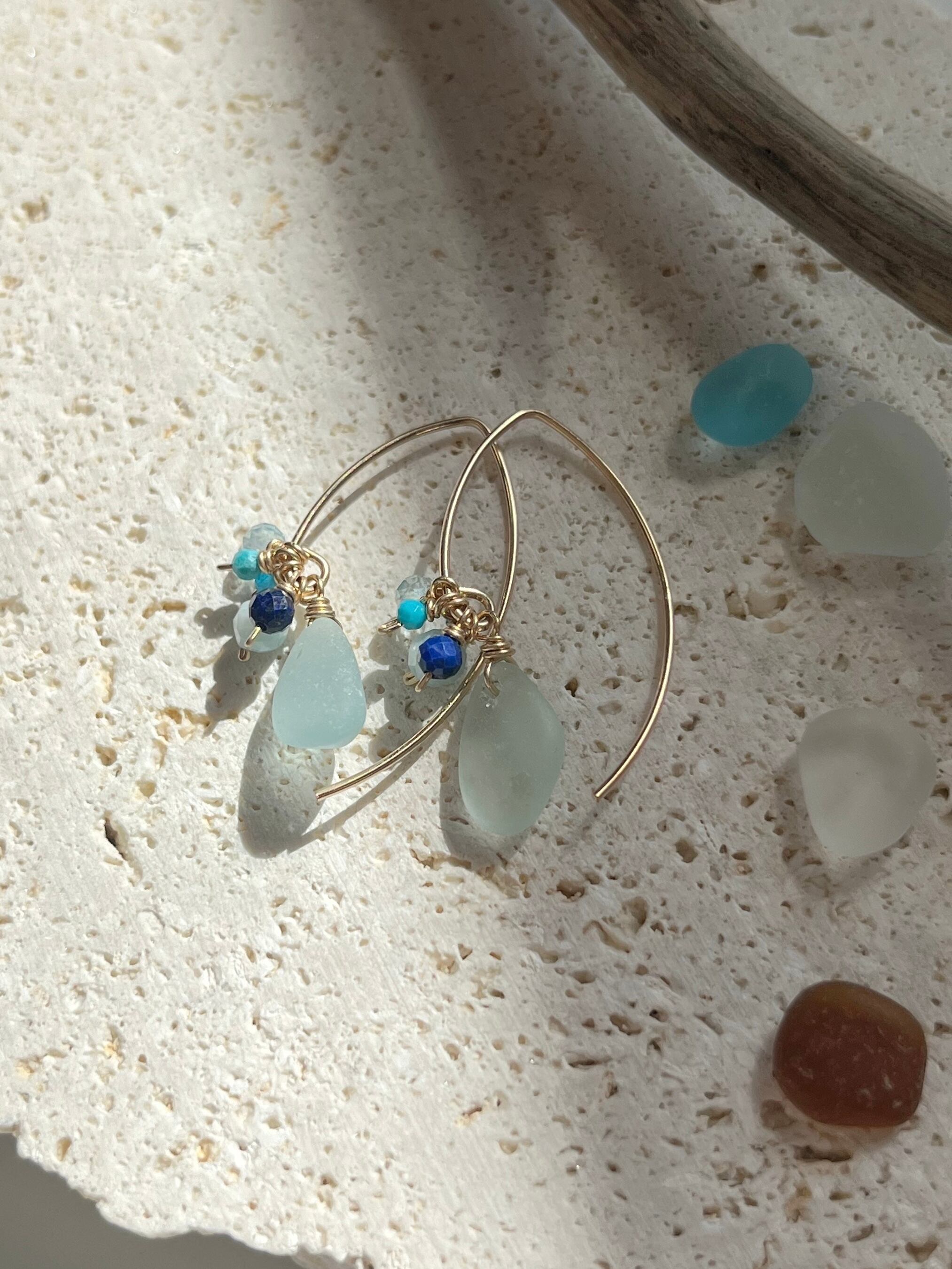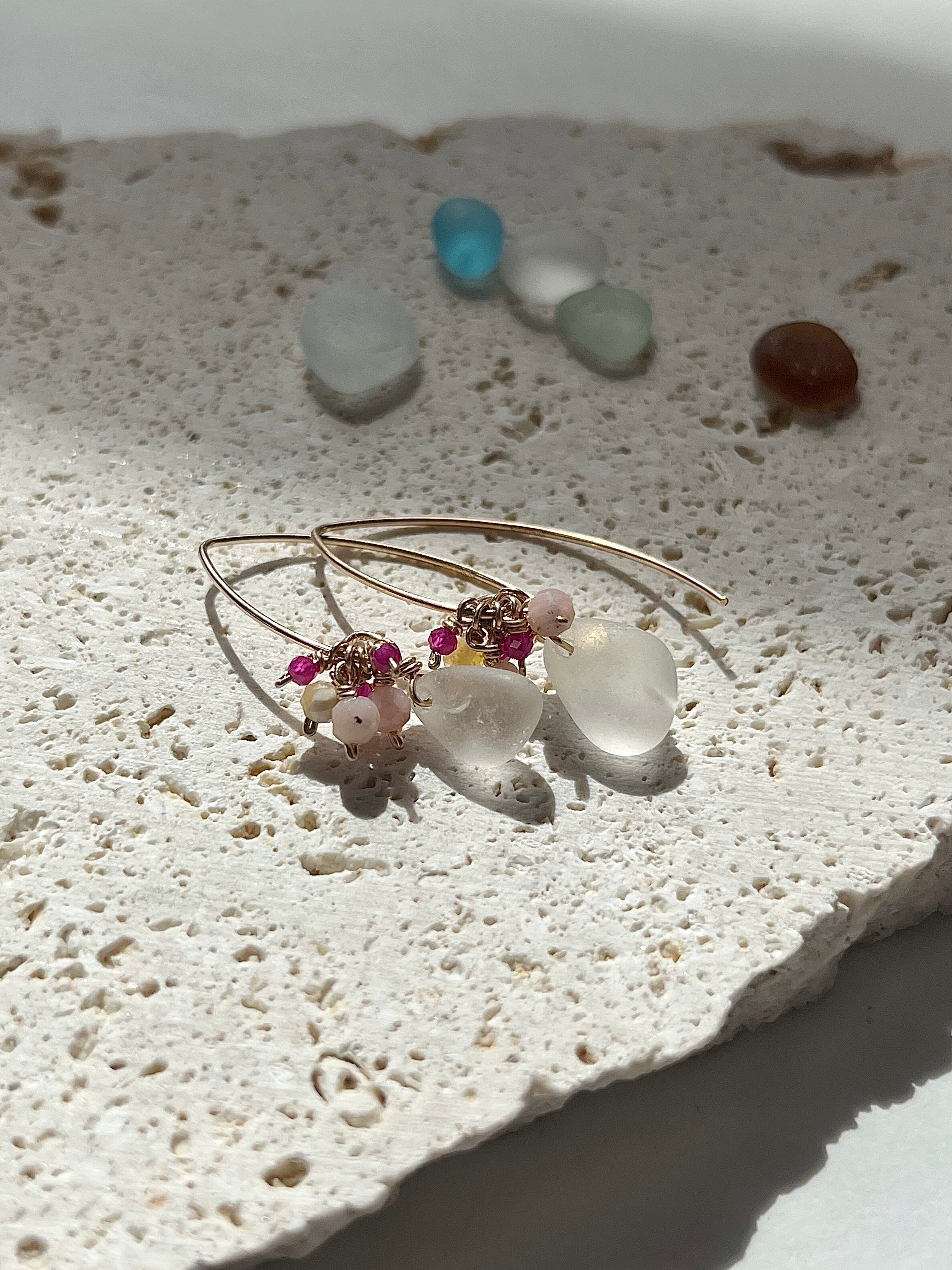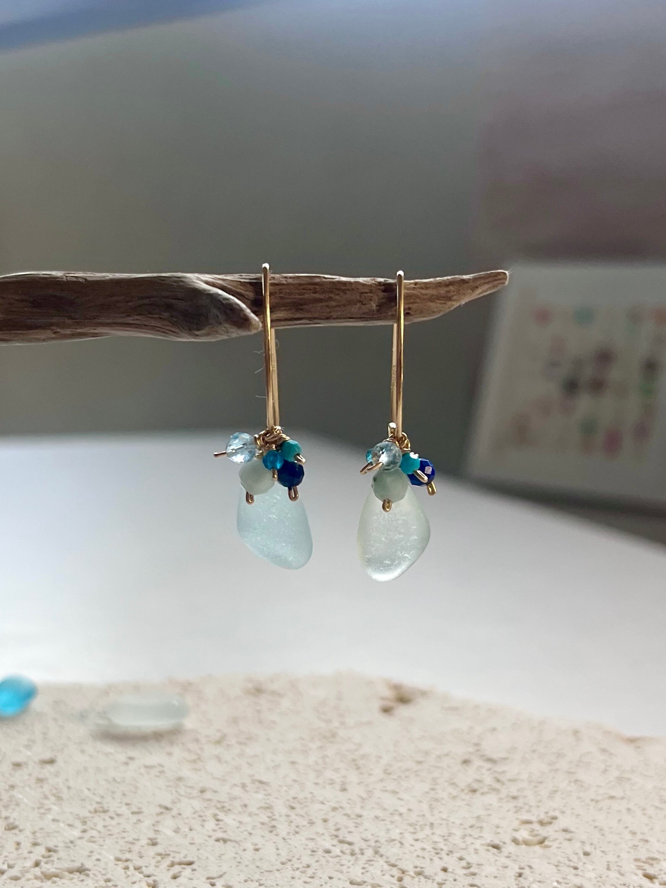 イヤリング変更可能(※イヤリングの金具の作り上、耳たぶのすぐ下に天然石とシーガラスが垂れるようになります)